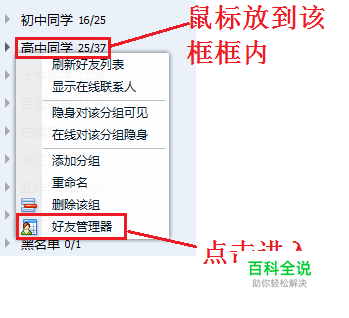 第一步:登录自己的QQ,找到好友分组,在该分组界面,比如图1中鼠标放在“高中同学”组上然后点击右键,找到【好友管理器】进入。