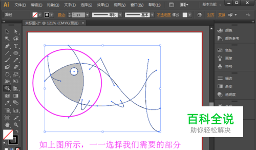 这是一个草图的小鱼,就是简单的几个钢笔工具画的弧线组成的。现在我们就要用到形状生成器工具了。首先,我们先要使用左侧工具箱中的选择工具,选中整个小鱼,也就是框选小鱼。