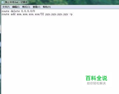 第一步,新建一个记事本,在里面输入route delete 0.0.0.0/0回车route add xxx.xxx.xxx.xxx/32 yyy.yyy.yyy.yyy-p。 其中XXX.XXX.XXX.XXX为所对应的服务器IP,yyy.yyy.yyy.yyy为你本地的网关,这里我们要注意,本地的IP一定要为固定IP,切不可设置成自动获取。