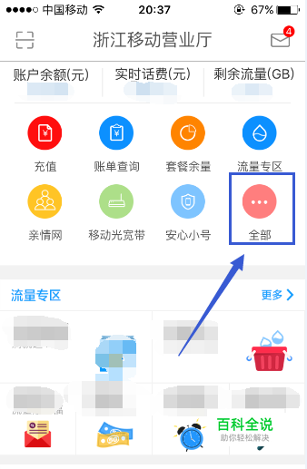 首先通过手机移动营业厅软件登录自己的手机号后,我们点击主页的“全部”按键。