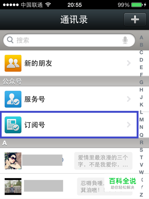 打开微信以后点击底部的 “通讯录”选项,再点击 “订阅号”,如图所示