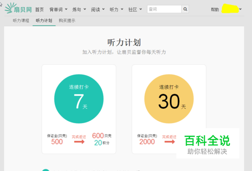 听力计划与阅读计划在相应的任务界面就可以看到,选择七天或者三十天适合自己的,支付扇贝即可加入。