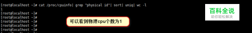 当然我们也可以针对某些指标进行查看,比如想查看查看物理CPU个数,我们可以通过命令"cat /proc/cpuinfo| grep "physical id"| sort| uniq| wc -l"。具体操作如下图所示。
