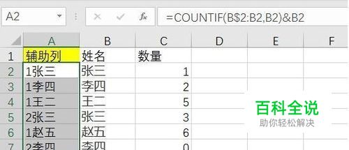 在A列前插入一列辅助列,在A2输入以下公式,然后向下填充公式 =COUNTIF(B$2:B2,B2)&B2 将当前行之前的姓名出现次数与姓名组合起来。