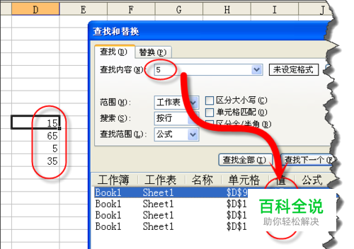 CTRL+F打开查找对话框,我在查找内容是“5”但大家可以清楚看到,只要单元格含5都可以查找出来。这其实与我们本来是查找“5”的真实目的不一致。因为Excel中默认的查找方式是模糊查找