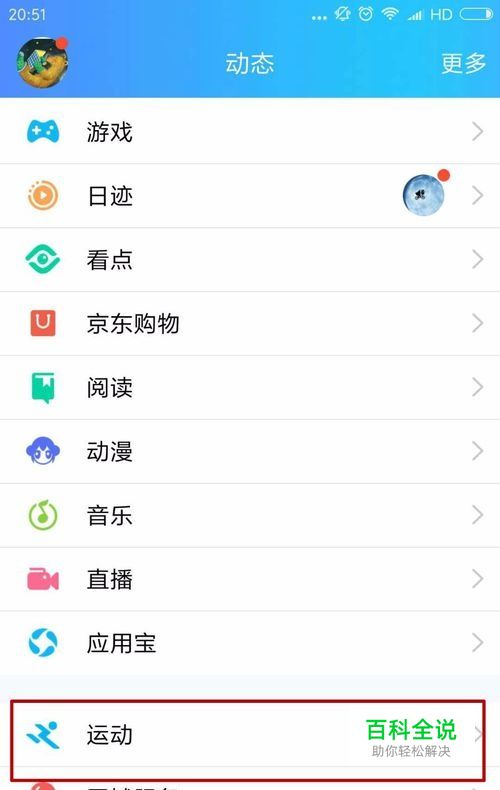 进入动态后,我们可以看到个人或好友的一些信息动态,有游戏、日迹、看点、京东购物、阅读等等,我们选择运动。