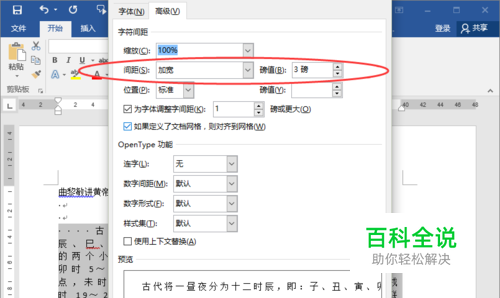 5、在高级选项卡栏下,在字符间距区域中,把间距设置为【加宽】磅值设置为【3】。然后在点击“确定”按钮。如图所示;