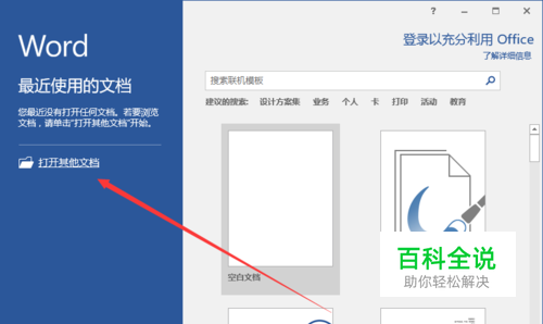 1、鼠标左键双击计算机桌面Word2016程序图标,将其打开运行。并点击“打开其他文档”选项。打开需要编辑的Word文档。如图所示;