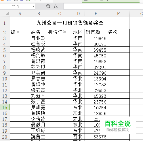 我们以九州公司销售人员的销售情况为例进行操作说明,首先打开销售数据表,对销售额进行名次大小的排列,表的结构及数据如下图: