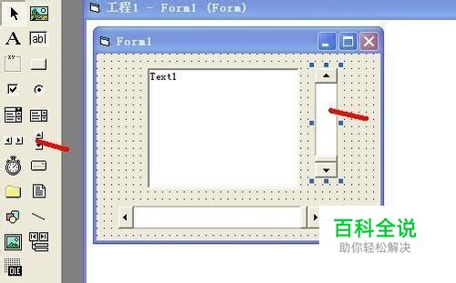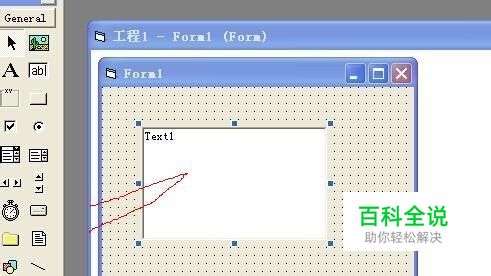 首先我们打开vb 6.0软件 进入到标准”工程1“界面,这些比较简单,就不一一上图了,在”form1“窗口上加载一个文本框”text1”如图