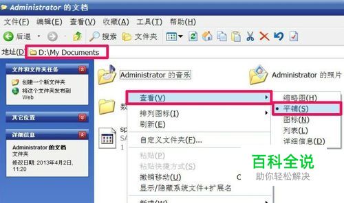 一次性设置所有文件夹成一种查看方式步骤: 1,我的电脑中,有的文件夹的查看模式为“平铺”,如果下图中的D:\My Documents这个文件夹。