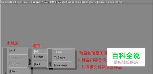 local(本地的)-- disk(硬盘)--to disk(硬盘到硬盘的复制) --to image(硬盘内容备份为镜像) --from image(从镜像文件恢复至硬盘)