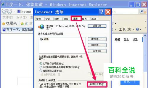 进入Internet 选项窗口后,选择“连接”选项卡,然后在其界面中找到“局域网(LAN)设置”下的“局域网设置”按钮。