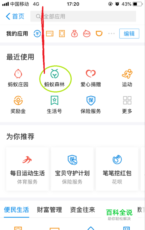更多选项页面,可以看到 蚂蚁森林 文字图标,点击进入该页面