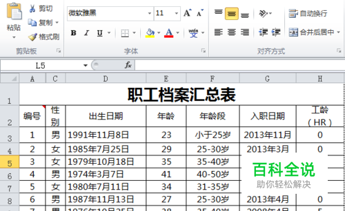 表格的第一二行一般是表格的名称和表格列信息,比如下图中的第一行为表名“职工档案汇总表”表格的第二行为各列的名称,比如本表为“编号”、“姓名”、“出生日期”、”年龄“等等。