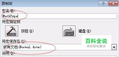 出现如下图对话框,将宏名改为“MathType”,将宏保存在中选择“所有文档(Normal.dotm)”,点击【确定】,开始录制宏;