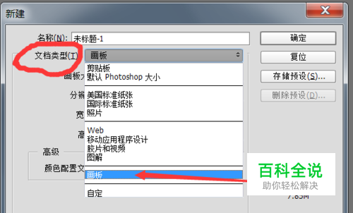 【第一步】打开ps软件,文件—新建,弹出对话框,在文件类型下拉框选择画板,并调整宽高数值,确认即可。