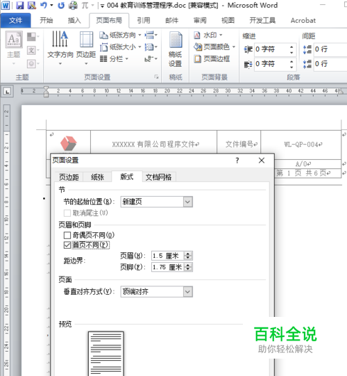 点选“页面布局”,再点选“页面设置”右侧的斜箭头,在出面的页面设置页的页眉和页脚项中勾选“首页不同”,再点选”确定“。