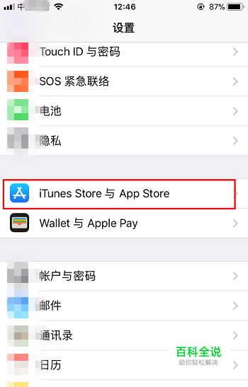 第二步,在打开的设置页面找到“iTunes Store 与 App Store”,并点击,如下图所示;