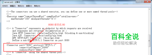 修改tomcat的监听端口为80端口: 在server.xml文件中找到: <Connector port="8080" protocol="HTTP/1.1" connectionTimeout="20000" redirectPort="8443" /> 修改成: <Connector port="80" protocol="HTTP/1.1" connectionTimeout="20000" redirectPort="8443" /> 如图: