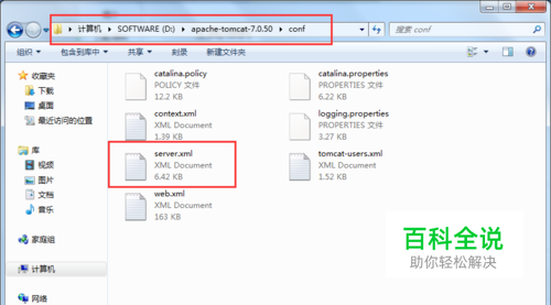 找到tomcat的主目录,进入conf文件夹,找到server.xml文件,并打开: