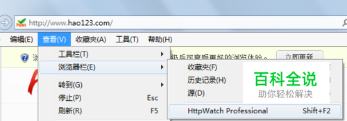首先安装httpwatch软件,安装好了之后,打开IE浏览器,可以按快捷键shift+F2可以调用httpwatch软件或者是在菜单栏那里找到“查看”目录下“工具栏(E)”下的“HttpWatch Professional”,点击一下就能调用啦。