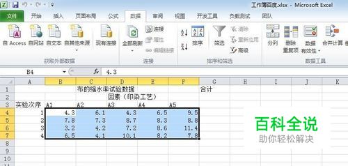 输入数据,以下图为列。选取五种印染工艺,每种工艺进行四次试验,分析不同的工艺对缩水率是否有影响。