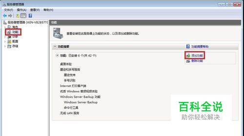 在服务器管理器的窗口中点击【功能】然后点击右边的【添加功能】