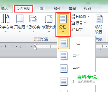 在菜单中的“页面布局”下,点击“分栏”,其下拉菜单中有不用数量的分栏,选中即可。此时,整篇文档都进行了分栏。