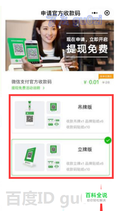 在申请页面中,有两种样式可以选择,一是吊牌版,二是立牌版,大家可以根据需要进行申请,首页申请只要0.01元哦!还包邮到家.