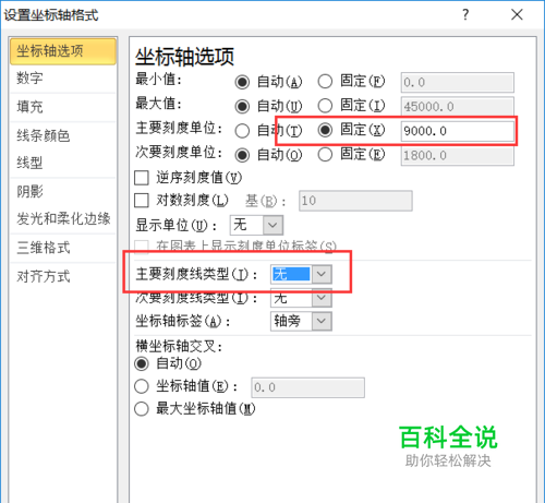将主要刻度单位上的数据改成‘9000’,主要刻度线类型为无
