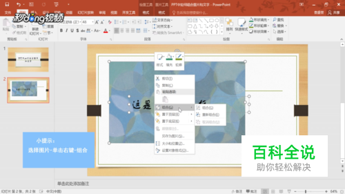 打开PPT,选择需要组合的图片和文字,单击鼠标右键,点击“组合”选项,在弹出窗口中再点击“组合”组合后可整体移动