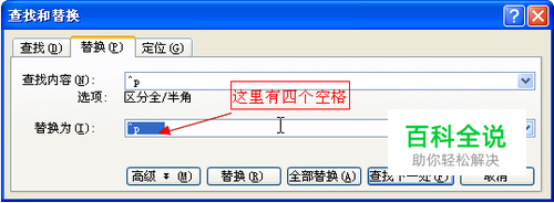 如果你想加入空格的同时,再在段落间加一个空行,可以在第四步时,把替换为内容改成“^p^p ”(含四个空格,不含引号)。