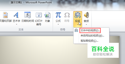 打开PPT,清空版面输入其他的内容,切换到插入选项卡,点击右侧的“视频”,单击“来自文件中的视频”