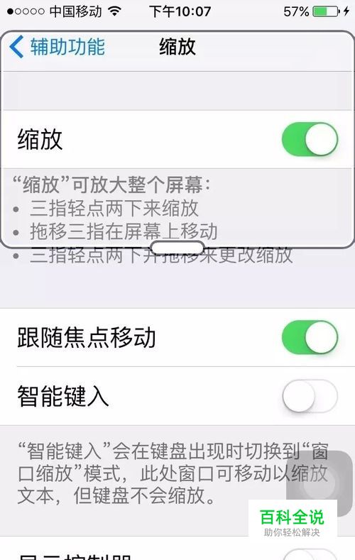 在“辅助功能”页面上,找到“缩放”功能键,点击打开。