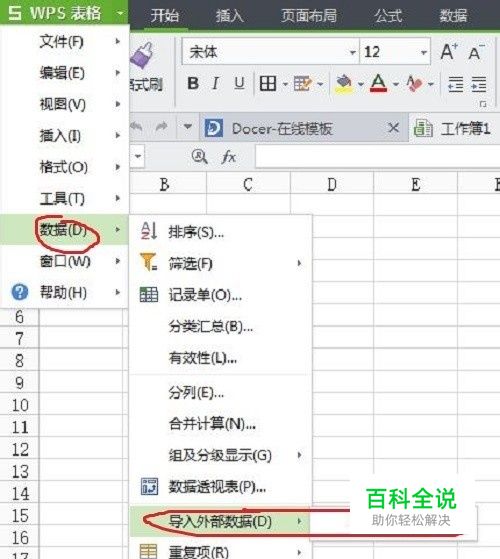 选择wps表格,【数据】→【导入数据】→【导入外部数据】,具体操作如下图所示。操作完成后会弹出选择数据源对话框