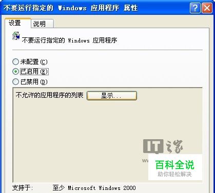 点击“显示…”,如下图。然后再点击“添加”,输入要禁用的程序名称(主运行程序名称),例如notepad.exe,如下图所示。然后点一直点确定,完成设置。