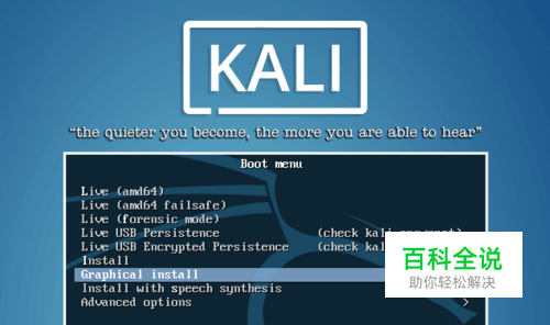 首先,把 USB 设备插入到要安装 Kali 操作系统的电脑上,然后从 USB 设备引导系统启动。只要成功地从 USB 设备启动系统,你将会看到下面的图形界面,选择“Install”或者“Graphical Install”选项。 本指南将使用“Graphical Install”方式进行安装。