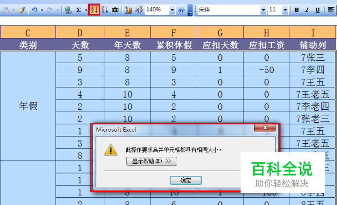 1、首先,看看“合并及居中”会给我们带来哪些不方便。如图所示,合并单元格会造成整个数据区域的单元格大小不一致,以至于在对数据进行排序时excel会提示错误,导致排序功能无法使用。