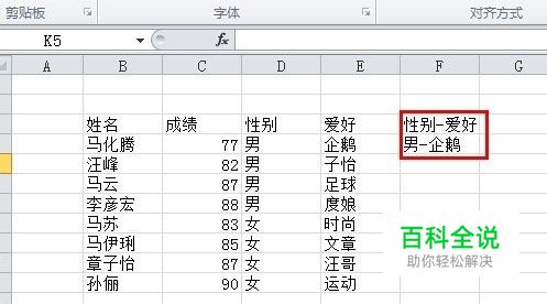 如果想在合并内容,如图,输入函数“=D4&"--"&E4”,意思是在 性别--爱好中添加了连个中横杠。