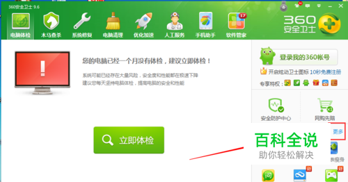 打开360安全卫士后,点击右侧功能大全旁的“ 更多”选项。如果是新版本,点击右下角的“更多”选项。