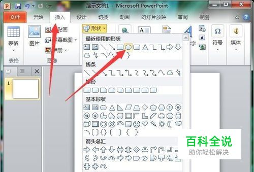 点击插入选项卡,再点击功能区中的形状,随便点击一个形状绘制出来,比如圆形。