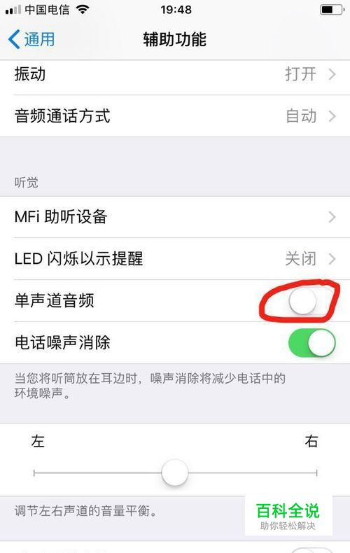 打开手机设置->通用->辅助功能->单声道音频,将“单声道音频”设置为关闭状态;电话噪声消除设置为开启状态