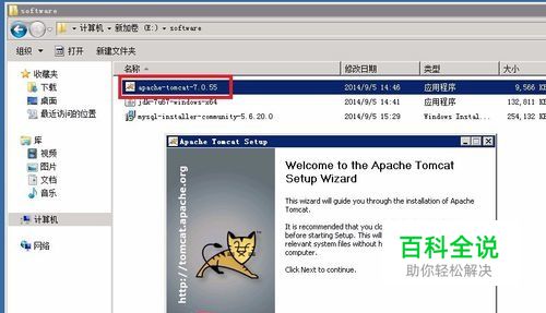 下载tomcat软件, 链接:http://pan.baidu.com/s/1i3gpOZN 密码:suz3 请注意也一定要选择与自己电脑操作系统位数相对应的tomcat,可以下载绿色无需安装的版本,也可以下载需要安装的版本,我下载的便是需要安装的版本,打开下载的tomcat软件,点击【下一步】,如图所示