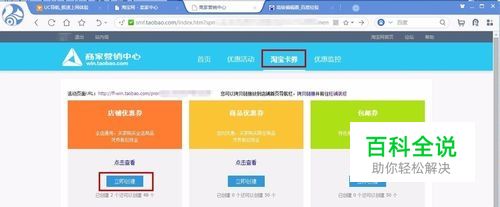 2、使用服务,选择淘宝卡券,以店铺优惠券为例,点击立即创建。