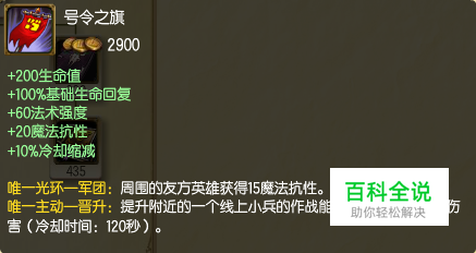 号令之旗 如果对面AP多,这时候就可以考虑出号令之旗了。不仅减CD,还能为团队增加魔抗。号令之旗的被动也十分好用。加强一个炮车,让车可以去带线,车吃的钱归号令之旗拥有者所有。
