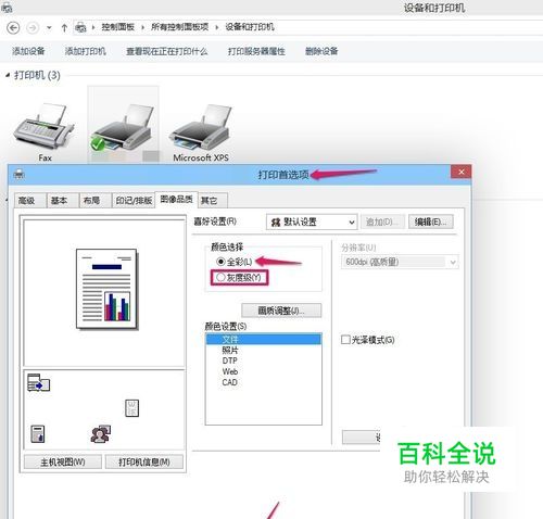 进入打印首选项 图像品质 颜色选择 1.全彩(要打印彩色的选中这个) 2.灰度级(要打印黑白的选中这个) 确定