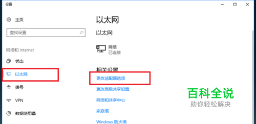 第一步在win10系统上,鼠标右键任务栏上的网络连接图标,选择打开网络和Internet设置,点击以太网->更改适配器选项,如下图所示: