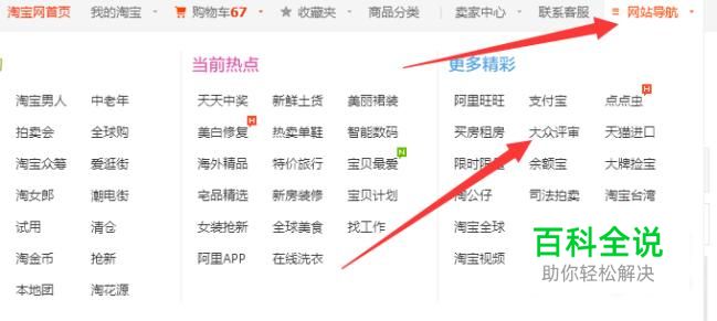 进入淘宝网站之后把鼠标箭头放在右侧的网站导航上面,在出现的栏目找到“大众评审”,然后点击打开。