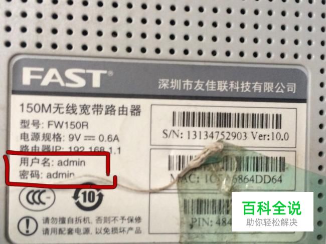 进入之后会弹出一个登录框,要求输入用户和密码,把路由器翻过来背面红色框中有密码,新的路由器一般用户名和密码都是admin